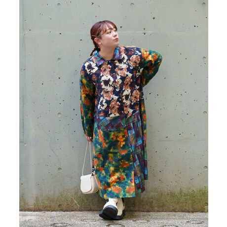 大きな花柄と、ふわっとしたぼかし柄の中にチェックを効かせた、存在感たっぷりのAラインワンピース。