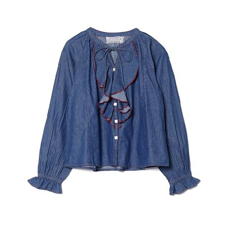 前あきのフリルが視線を集める、存在感たっぷりのデニムブラウスが登場。
