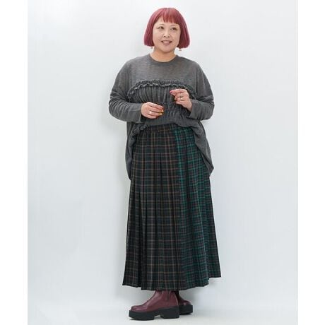 2種類のチェックを前後で組み合わせた、遊び心たっぷりのドッキングスカート。