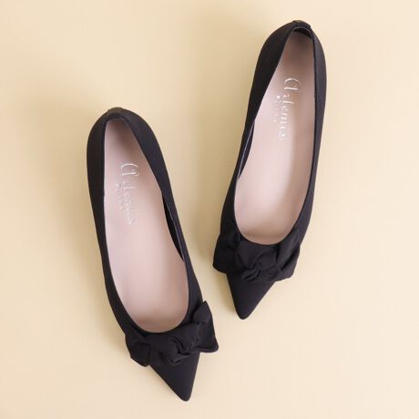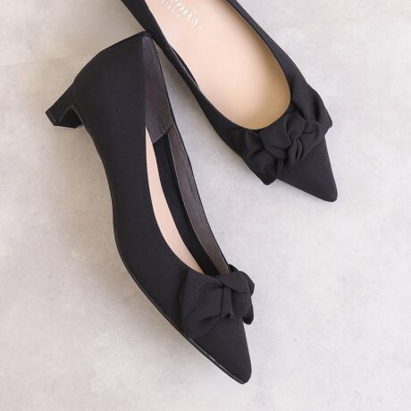 ・ふんわりと結んだビッグリボンがレディライクな上品パンプス。大人も履きやすいバランスにこだわりました。