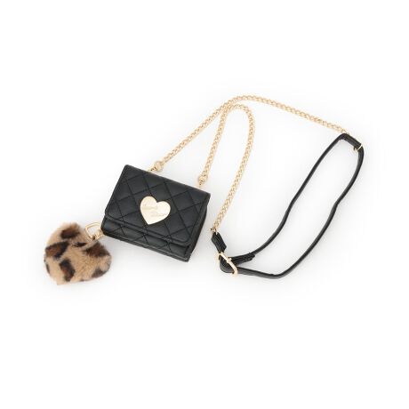 大人っぽい雰囲気がただようキルト生地のチェーンウォレットです。煌めくメタルチェーンやハート型のパーツで、アクセントを利かせました。フェイクファーのヒョウ柄チャームとショルダーストラップはつけ外しでき、気分に合わせて使い分け可能。お買い物やちょっとした外出にもおすすめのアイテムです。