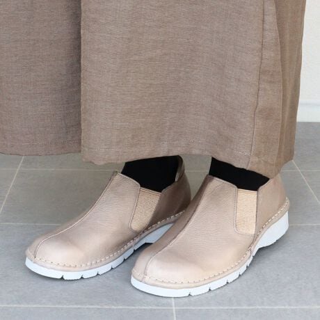 ・継ぎ目を真ん中にすることで甲高の方も足入れしやすく、サイドに大きめのゴムが入っているので脱ぎ履きも楽ちん