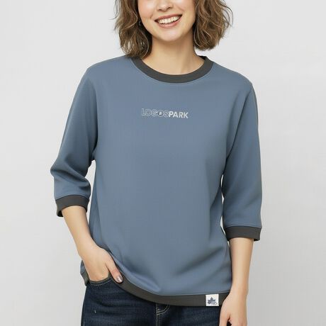 ベーシックなクルーネックの7分丈Tシャツを、首元と袖口に配色パイピングを施したリンガーデザインで仕上げています。