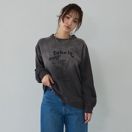 ゆったりめのラグランスリーブトップス。目を引くプリントがしっかりカジュアルでいて、ヴィンテージライクな風合いにより大人の外しアイテムに相応しい1枚です。全体の日焼け加工とテンションを合わせたヴィンテージ風プリントは、カラーによりそれぞれ違う物になっているので、選ぶ楽しさも◎