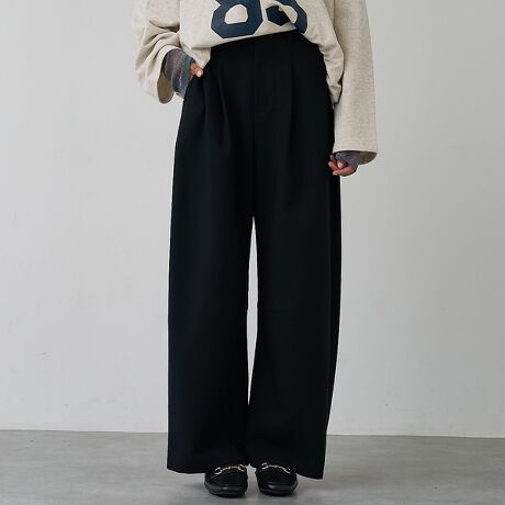 ダブルクロスの上質な素材で旬のカーブパンツを仕立てました。トレンドに慎重な方も安心して取り入れられるオンオフ着回しの効く自信作です。女性らしいとろみと、カーブシルエットをちゃんと演出するハリ感を両立。絶妙に計算されたカーブラインはカジュアルになり過ぎないのが魅力です。ウエストは後ろゴムで履き心地はとっても楽なのに、腰回りもスッキリ見せてくれるのでタックインもキレイに決まります。