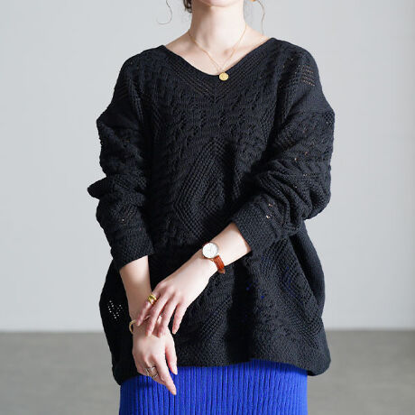 日常に取り入れやすい、透かし編みニットプルオーバー。太ももにかかる着丈、手の甲までの長い袖、ゆるっとしたシルエットが魅力的。Vネックで顔周りをすっきり見せ、ダイヤ柄の透かし編みでおしゃれ度をアップ。ゆとりのあるシルエットで、身体のラインを拾わず体型カバーも◎。素材はアクリルニットで柔らかく暖かさも抜群。インナーに合わせて透け感を楽しめ、どんなボトムスにも合うデザイン。着るだけって今っぽい奥行きが生まれる、装いの完成度を高めてくれます。