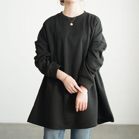 ふんわり広がるAラインが魅力の裏起毛フレアチュニック。ラウンドネック×オーバーサイズで仕上げた大人のためのリラックストップス。ドロップショルダーの落ち感と太もも真ん中まで届く長め丈。気になる腰まわりやヒップをカバー、着るだけで軽やかな印象を演出。計算されたフレアラインが、上半身をすっきり見せてくれるのも嬉しいポイント。デイリーに使いやすく、ワンマイル・普段使い・ルームウェアまで幅広く活躍。裏起毛で暖かく、安心の頼れるチュニックで心地よく過ごせる一日をお楽しみください。