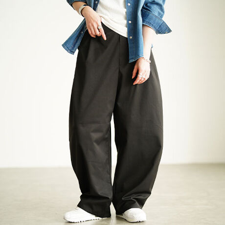程よいハリ感のある生地で仕立てた、バレルレッグシルエットのハイウエストパンツ。穿いた瞬間からこなれ感漂うシルエットに、シンプルながらも存在感を放つ一本。ゆるっとしたシルエットながらも、野暮ったさを感じさせず、トレンド感のあるスタイリングに仕上げてくれます。ウエストからタックを入れることで、腰まわりを包みながら立体的なフォルムを生み出し、気になるラインをふんわりカバー。裾に向かって緩やかに細くなるワイド幅は、ゆったりとした穿き心地でありながら、全身のバランスをすっきり見せてくれます。