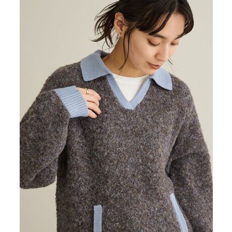 柔らかな配色を生かしたニットプルオーバーです。深すぎないVネックはデコルテをきれいに見せ、顔まわりを明るく演出します。前ポケットはさりげないデザインポイントになり、ちょっとした小物を入れるのにも便利です。ウール混糸ならではのふくらみと暖かさがあり、肌あたりも優しい着心地です。厚みは程よく秋冬のカジュアルシーンにぴったりで、コートやジャケットとも相性が良いです。デニムやロングスカートと合わせるだけで上品な日常スタイルが完成します。