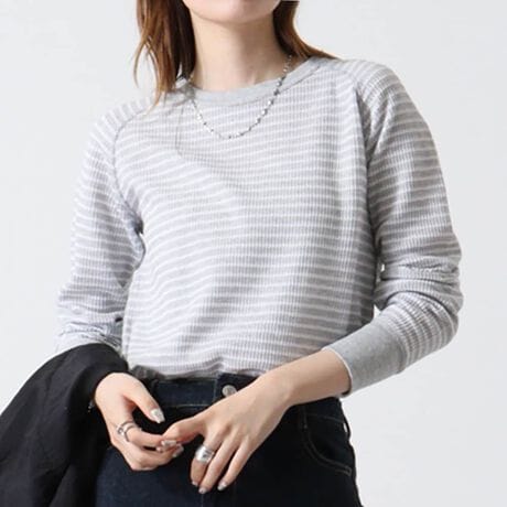 ベーシックな配色で色々な着こなしに合わせやすいボーダー柄のラグランクルーネックL/S-Teeです