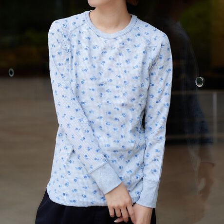 綺麗な青い小花柄のラグランクルーネックL/S-Teeです