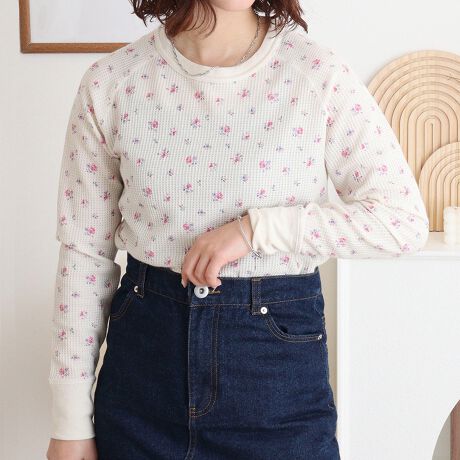 ビンテージテイストがかわいい小花柄のラグランクルーネックL/S-Teeです