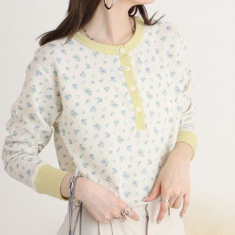 ビンテージテイストがかわいい小花柄のクレリックヘンリーネックL/S-Teeです