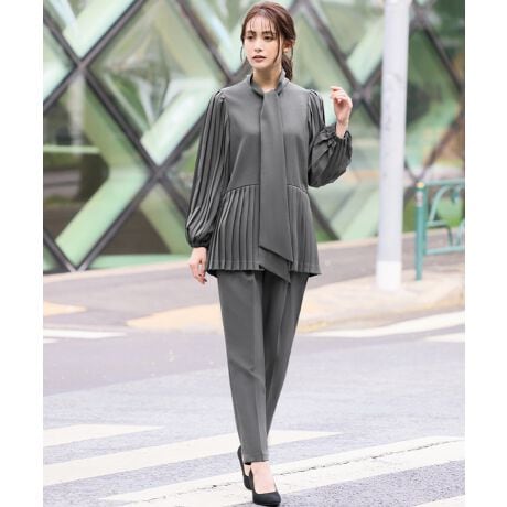 洗練された大人の女性に贈る表情豊かなプリーツブラウスとテーパードパンツの2点セットスーツ。