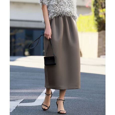ふんわりとしたウエストまわりから裾にかけてすっきりとしたサイズ感のコクーンシルエットスカート。