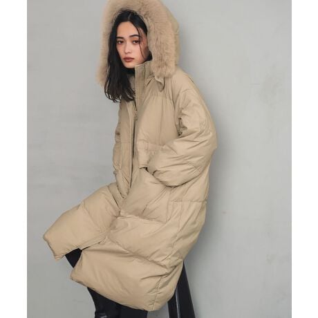 ボリューミーなフォックスファーが高級感のあるロング丈コート。