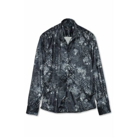 レオパードとローズを大胆にコラージュし、ベロアに乗せた総柄プリントシャツ。