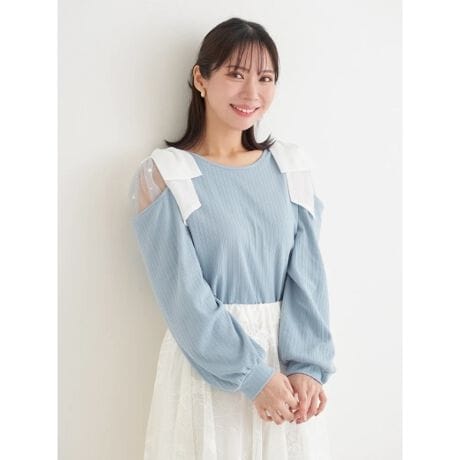 チュール仕様の肩開きデザイン&肩リボンをあしらった大人の華やぎトップス