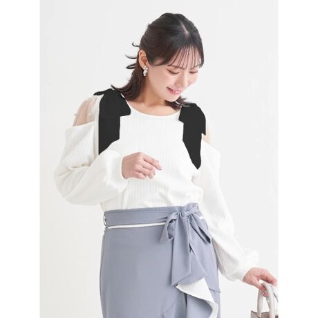 チュール仕様の肩開きデザイン&肩リボンをあしらった大人の華やぎトップス