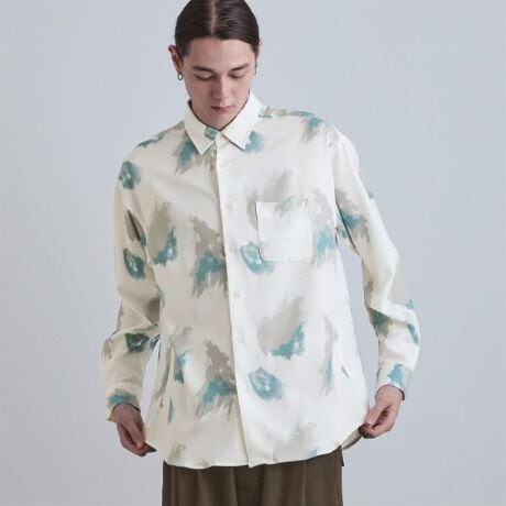 煙(スモーク)が滲んだような、独創的なブラープリントを施したレギュラーカラーシャツ。