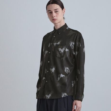 煙(スモーク)が滲んだような、独創的なブラープリントを施したレギュラーカラーシャツ。