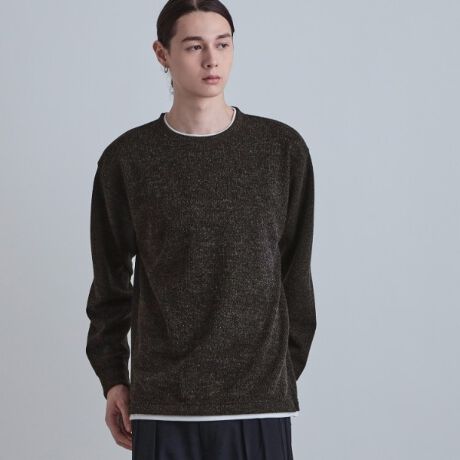 クルーネックの首元と裾に別布をドッキングさせた、フェイクレイヤードデザインのプルオーバー。