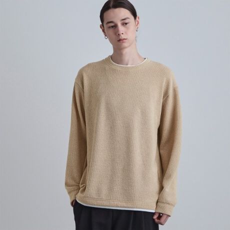 クルーネックの首元と裾に別布をドッキングさせた、フェイクレイヤードデザインのプルオーバー。
