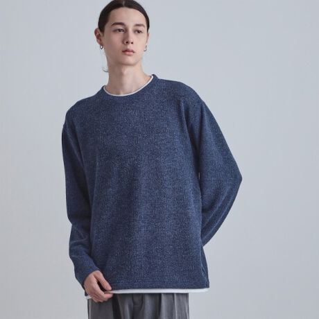 クルーネックの首元と裾に別布をドッキングさせた、フェイクレイヤードデザインのプルオーバー。