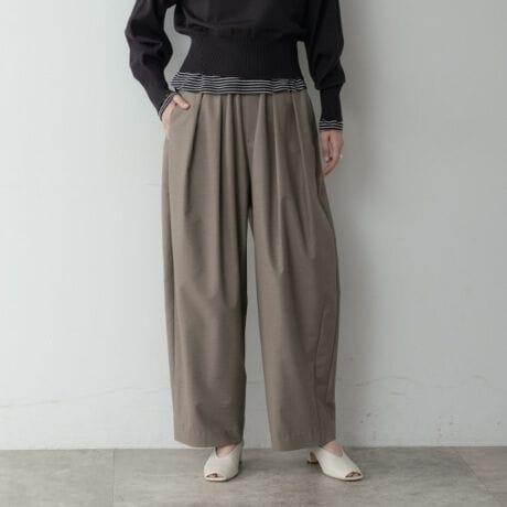 特徴的なウエストデザインとワイドシルエットが魅力のパンツ。
