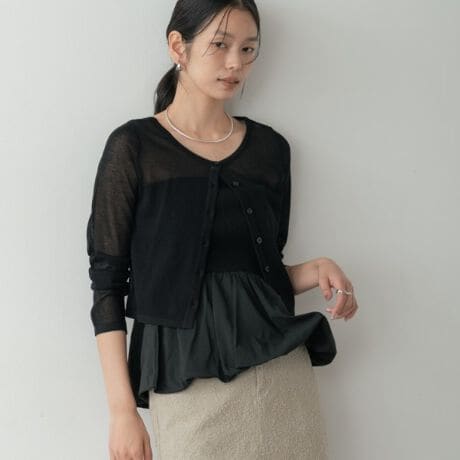 軽やかなシアーカーディガンとリブベアトップのコンビネーションが印象的なアンサンブル。