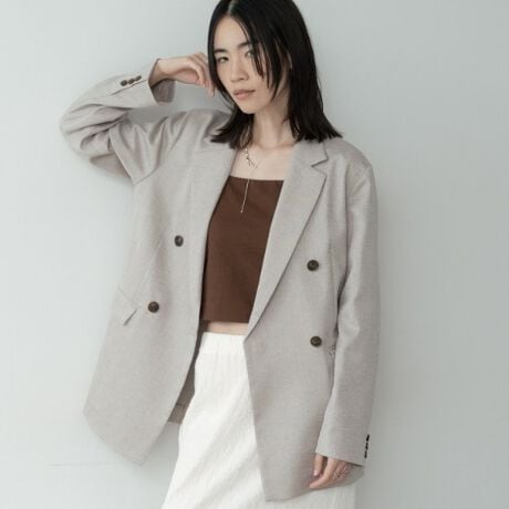 シャープなシルエットのダブルブレストジャケットが特徴。