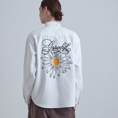背面に大胆にあしらったデイジー柄の刺繍が目を惹くシャツ。