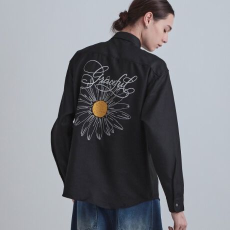 背面に大胆にあしらったデイジー柄の刺繍が目を惹くシャツ。