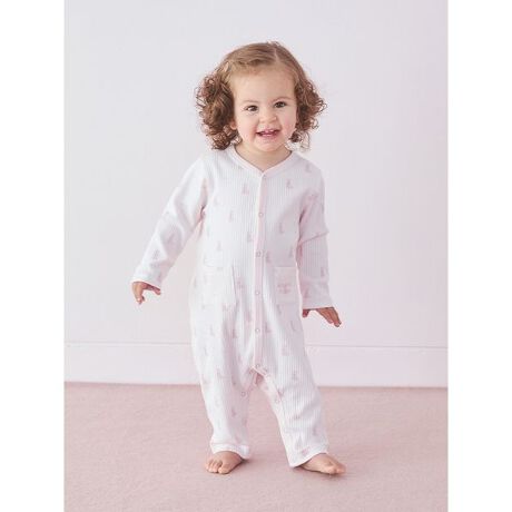 淡く優しいカラーリングに、子どもたちが大好きなぬいぐるみ柄をあしらったカットソーシリーズにうさぎモチーフが新登場。お座りしているうさぎの絵を総柄プリントした、ロングシーズンで着用いただける長袖のBABYロンパースです。フロントポケットに発泡プリントのロゴをデザイン。リブ入りの柔らかな素材感と、赤ちゃんの可愛さを引き立てる青みのあるきれいなピンクがポイントです。パウダーアニマルのうさぎシリーズと合わせたり、KIDSサイズと合わせればきょうだいでお揃いのコーディネートも可能。出産祝いなどのギフトにもおすすめです。