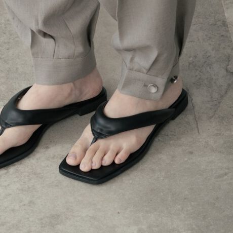 スクエアトゥとビーチサンダル風のディテールが、カジュアルながらも洗練された印象を与えます。
