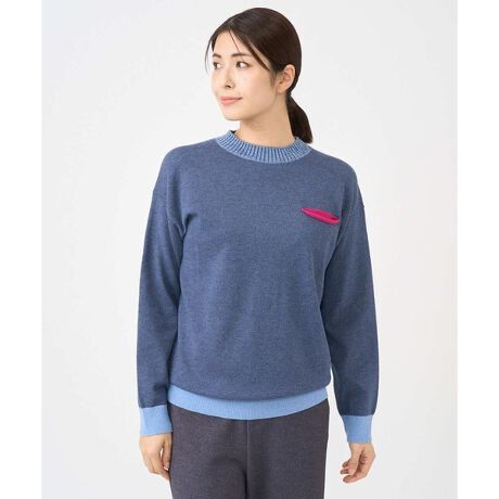ゆったりとしたシルエットで、リラックス感のあるデザインニットです。身頃は天竺編みでシンプルに仕上げつつ、衿・裾・袖口にはリブ素材で、配色デザインでアクセントにしています。さらに前身頃には、同じく配色仕様のポケットがちらりと覗く遊び心あるディテールを加えました。後身頃の衿部分には、さりげなく鹿の子編みを施してポイントにしました。