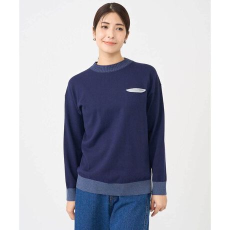 ゆったりとしたシルエットで、リラックス感のあるデザインニットです。身頃は天竺編みでシンプルに仕上げつつ、衿・裾・袖口にはリブ素材で、配色デザインでアクセントにしています。さらに前身頃には、同じく配色仕様のポケットがちらりと覗く遊び心あるディテールを加えました。後身頃の衿部分には、さりげなく鹿の子編みを施してポイントにしました。
