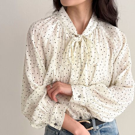 ・落ち感のある素材でボウタイも甘くなりすぎず取り入れやすい一枚です