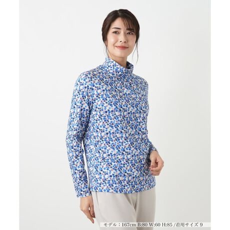 可憐な小花柄が着こなしを上品に彩るハイネックカットソーです。生地は世界的なテキスタイルブランドとして名高い「リバティジャパン社」とのコラボレーションにより独自に開発・製造された素材を使用。首元には細やかなギャザーを施し、顔周りを華やかに見せると同時に、ふんわりとした女性らしいシルエットを演出。伸縮性に優れたカットソー素材のため、動きやすくリラックスした着心地を実感できます。一枚着としてはもちろん、ジャケットやカーディガンのインナーとして柄を覗かせるレイヤードスタイルにも最適。これからの季節のワードローブに上質な彩りを添える一枚です。
