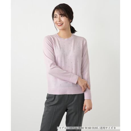 繊細なラメ糸を織り込んだニット地に、ホットフィットビジューを前身頃全体に散りばめた、華やかなクルーネックニットです。動くたびにビジューとラメが控えめに煌めき、顔周りを明るく見せてくれます。派手になりすぎない上品な光沢感は、大人の女性がデイリーにも着られる絶妙なバランス。やや薄手ながら伸縮性に優れたニットを使用しており、アウターインでももたつかず快適な着心地を実感できます。一枚で主役になるのはもちろん、ジャケットやコートの下からちらりと覗かせるインナーとしても活躍します。