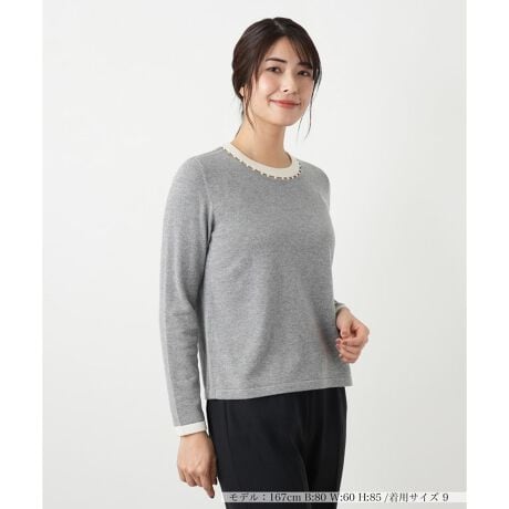 ネックラインに並んだパール調ビジューと、清楚な配色のアクセントが目を惹くニットプルオーバーです。首元と袖口に施されたバイカラーのラインが、落ち着いた色合いのニットに爽やかなエッセンスをプラス。ネックレスを身につけているかのようなビジューの首元が、顔周りを明るく上品に見せてくれます。主張しすぎないデザインなので、オフィスシーンやきちんとした席にも最適。やや薄手のニットでジャケットのインナーとしても活躍する、冬のワードローブに加えたい一枚です。