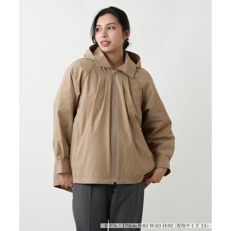 襟元と背面に施された大胆なタックが、ふんわりとした立体的なシルエットを描くカジュアルコートです。 身体のラインを拾いにくいゆったりとしたフォルムが特徴。中わた入りで保温性をキープしながらも、着膨れして見えない絶妙なバランスに。肩周りはラグランスリーブ仕様のため動きやすく、厚手のニットの上からでも窮屈感なく羽織れます。裾にはドローコードが通っており、絞ることで丸みのあるコクーンシルエットへとアレンジが可能。フードは取り外しができ、外せばステンカラーのようなすっきりとした表情に変化します。