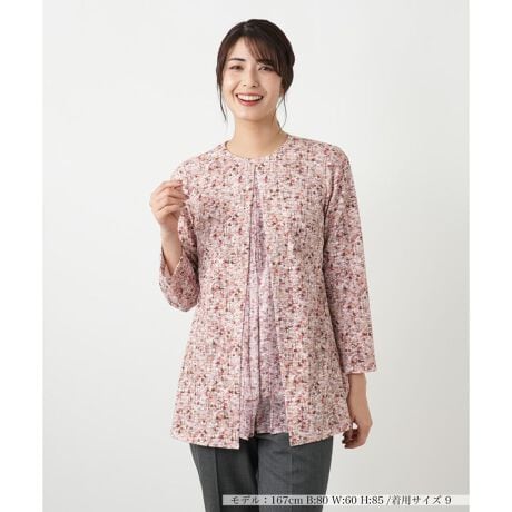 ミックスカラーのツイード調デザインで仕上げたブラウスです。上品な華やかさを保ちつつ、Tシャツ感覚で着られるストレスフリーな着心地を実現しました。フロント中央には、あえて伸縮性のない織地をパネル状に切り替えて配置。異素材のコントラストが、縦のラインを強調してすっきりとした印象を与え、シルエットの崩れを防ぐ役割も果たします。背中はファスナー仕様で着脱もスムーズ。きちんと感がありながらも動きやすく、長時間のデスクワークや華やかなランチの席でもリラックスして過ごせる、大人のための技ありアイテムです。バックファスナーにより開閉が可能。