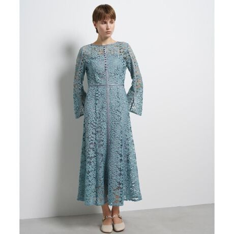 レースのワンピースは、すっきりとした身頃にソフトマーメイドラインのスカートを掛け合わせたシルエット。生地を贅沢に使った裾まわりが、動くたび華やか。生地の落ち感も相まって甘くなりすぎず落ち着いた印象に。マットな質感の中に、光沢あるサテン生地のパイピングとクルミボタンがアクセントになっている。控えめに広がる袖のスリットも、上品に見せてくれるポイントに。