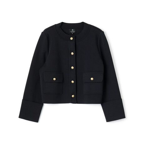 洗練されたノーカラーのデザインには、ゴールドのボタンが華やかなアクセントを添え、装いに品格を与えます。