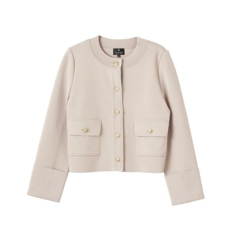 洗練されたノーカラーのデザインには、ゴールドのボタンが華やかなアクセントを添え、装いに品格を与えます。