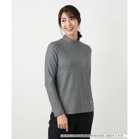 繊細なラメを編み込んだ、上品な煌めきを放つハイネックニットです。派手すぎない控えめな輝きが秋冬のコーディネートを明るく彩り、顔周りを華やかに見せてくれます。首元は程よい高さで窮屈感なく、すっきりと知的な印象に仕上げました。縦ラインを強調する細めのリブ編みを採用しており、ボディラインを拾いすぎない絶妙なフィット感を実現しています。前身頃の左裾には小さなゴールドのロゴパーツをあしらい、シンプルなデザインにさりげないアクセントをプラス。ジャケットやアウターのインナーとしてちらりと見せても素敵です。