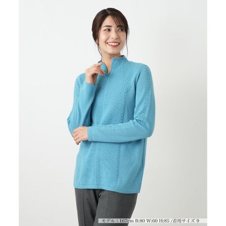 首元のスリットが顔周りに抜け感と女性らしさをプラスするハイネックニットです。冬の定番であるハイネックですが、フロントにV字のスリットを入れることですっきりと見える絶妙なバランスに仕上げました。身頃のサイドと袖部分にのみ配されたケーブル柄もポイントになっており、あえてセンターフラットな編地にすることで、縦ラインが強調されて細見えする効果も。アウターに響きにくいやや薄手のニットでコートのインナーとしても優秀。オフィスからデイリーまで幅広く活躍する一枚です。