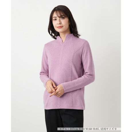 首元のスリットが顔周りに抜け感と女性らしさをプラスするハイネックニットです。冬の定番であるハイネックですが、フロントにV字のスリットを入れることですっきりと見える絶妙なバランスに仕上げました。身頃のサイドと袖部分にのみ配されたケーブル柄もポイントになっており、あえてセンターフラットな編地にすることで、縦ラインが強調されて細見えする効果も。アウターに響きにくいやや薄手のニットでコートのインナーとしても優秀。オフィスからデイリーまで幅広く活躍する一枚です。