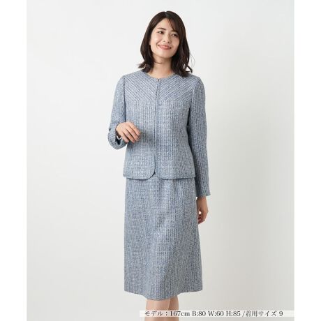 爽やかな色合いのミックスツイードが、清潔感と上品な華やかさを演出するセレモニースーツです。ジャケットは首元をすっきりと美しく見せるノーカラー、前立てからネックラインにかけて施された繊細なラメパイピングが煌めき、顔周りを明るく引き立てます。フロントはカギホック仕様で洗練されたミニマルな印象をキープ。胸元のさりげない切り替えが視線を上に集めてスタイルアップ効果も期待できます。スカートは、広がりすぎない優美なシルエットで、大人の女性にふさわしい落ち着きを表現。サイドホック&ファスナーで着脱もスムーズです。